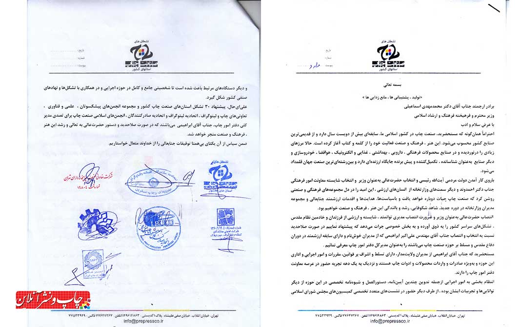 گفتنی است یک ماه قبل در نامه ای که در پیوست آمده؛ اتحادیه ها، تشکل ها و انجمن های مرتبط با صنعت چاپ از وزیر و معاون امور فرهنگی وزارت فرهنگ و ارشاد درخواست کردند تا علی اکبر ابراهیمی که از مدیران خوش نام و با سابقه و مسلط بر حوزه صنعت چاپ است را به عنوان مدیرکل دفتر امور چاپ منصوب کنند. به دلیل اینکه در این خصوص به صورت ضمنی قول مساعد داده شد، این نامه به وزارتخانه ارسال نشد.
