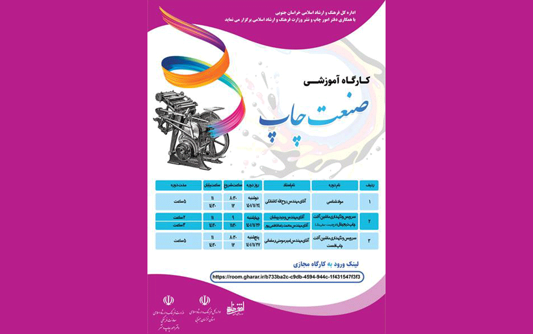 به گزارش چاپ و نشر آنلاین به نقل از روابط عمومی اداره کل فرهنگ و ارشاد اسلامی خراسان جنوبی؛ علی فرخنده مدیرکل فرهنگ و ارشاد اسلامی خراسان جنوبی گفت: در راستای ارتقای دانش صنعت چاپ و افزایش سطح مهارت شاغلین در رشته های مختلف چاپ دوره آموزشی مهارت افزایی شاغلین صنعت چاپ در حوزه های «مواد شناسی»، «سرویس و نگهداری ماشین آلات چاپ دیجیتال» و «سرویس و نگهداری ماشین آلات چاپ افست» در بهمن ماه جاری در استان برگزار می شود.