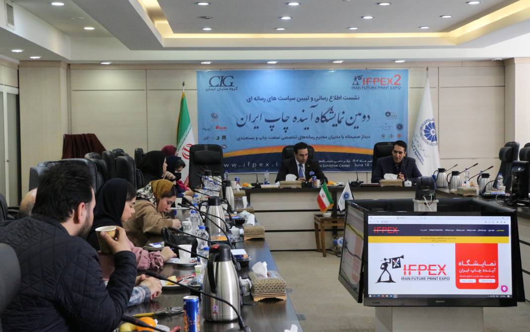 نشست اطلاع رسانی و تبیین سیاست های رسانه ای دومین نمایشگاه آینده چاپ ایران چهارشنبه ۲۴ اسفندماه با حضور بابک عابدین رئیس نمایشگاه آینده چاپ ایران و رئیس اتحادیه تولیدکنندگان و واردکنندگان صنعت چاپ و بسته بندی ایران، مسعود عرفانی مدیر امور تشکلهای اتاق بازرگانی صنایع و معادن و کشاورزی ایران، هادی حسینی نژاد مدیر روابط عمومی آوردگاه آینده چاپ ایران (IFPEX) و جمعی از اصحاب رسانه در محل اتاق بازرگانی صنایع و معادن و کشاورزی ایران برپا شد.